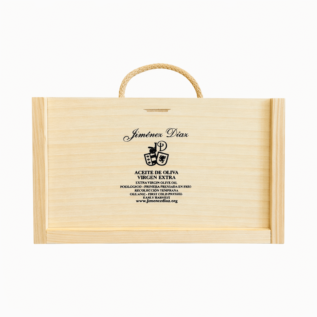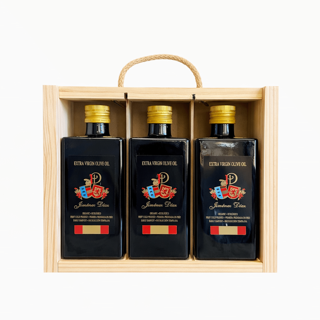 Estuche de madera con tres botellas de 500 ml de Aceite de Oliva Virgen Extra ecológico elaborado con aceituna Hojiblanca de recolección temprana.